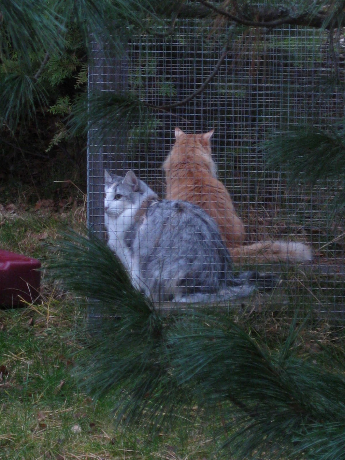 Kissatkin haaveilevat ulospääsystä. Se ei oikein onnistu ennen lumen sulamista. Olen yrittänyt viedä valjaissa ja ne jähmettyvät niille jalansijoilleen. Toinen hyppäsi auton konepellille turvaan tuota kamalaa, kylmää ainetta.Tässä kisuleiden haaveunet: pihahäkki, jossa on "vapaa" ja saa vapaasti kytätä vieressä olevan kuusen pikkulintuja. Joskus siili tekee ihan tahallaan spurtin häkin ympäri ja kissa samanlaisen spurtin sisäpuolella : )